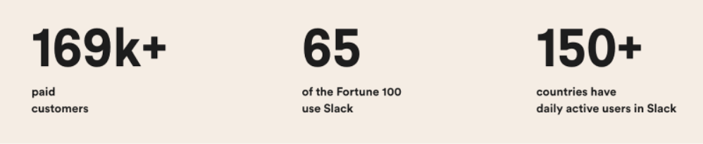 Slack, an acronym for “Searchable Log of All Conversation & Knowledge,” set out to “make work-life simpler, more pleasant, and more productive” by bringing the right people, tools, and information together. Today, companies like Netflix, Uber, Target, Intuit, and an astounding 65 of the Fortune 100, use Slack. The company boasts more than 169k paid customers and daily active users in more than 150 countries worldwide.