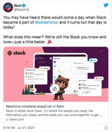 On July 21, 2021, Salesforce — the world’s leading CRM service provider — completed its acquisition of Slack in a $27.7 billion deal. Shares have since risen more than 6%. So far, Salesforce only plans to add the messaging app to its enterprise software suite without immediately changing Slack’s functionality, branding, or leadership.